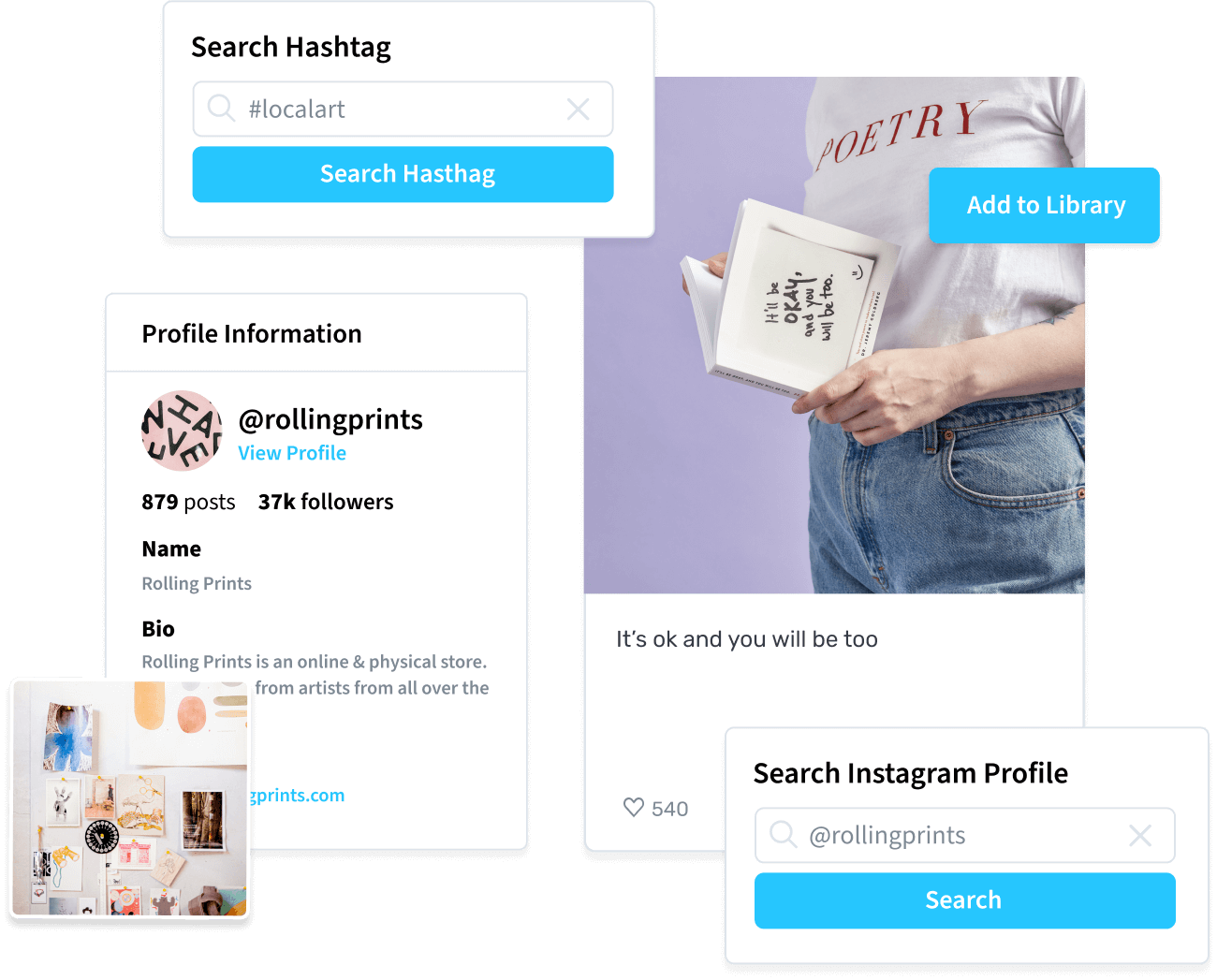 Browse your favorite Instagram business and creator accounts, then save content to your Media Library for easy scheduling.